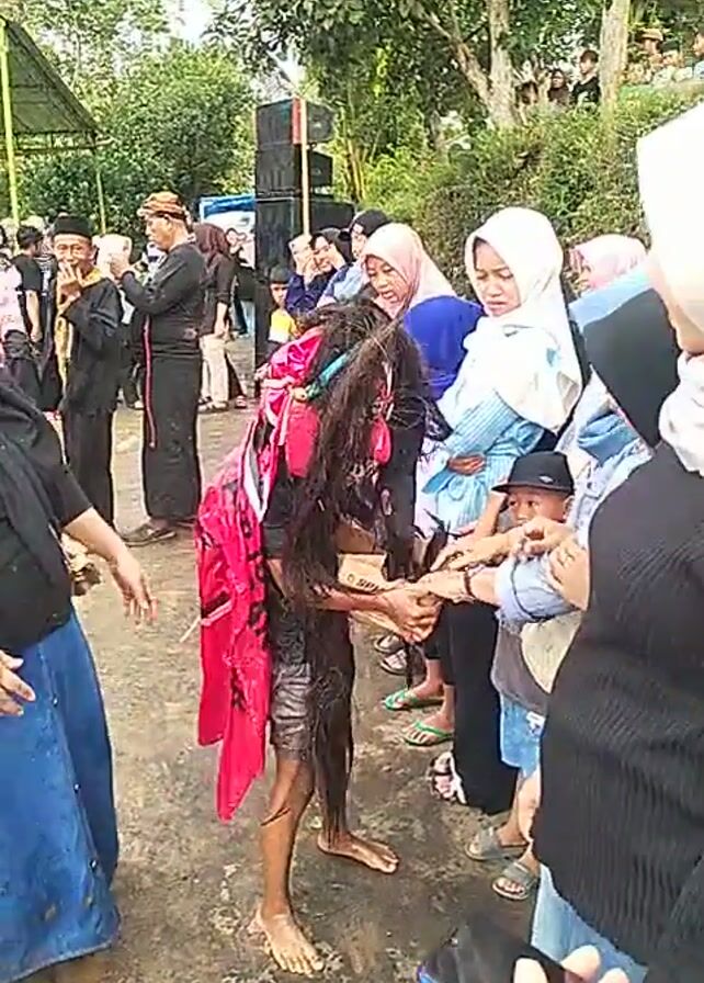 person wearing a black hairy costume and a red mask, appearing to perform a ritual dance. The person is barefoot and wears a red cloth around their waist. The performer is holding what appears to be a piece of cardboard. The person is surrounded by a crowd, many of whom are wearing headscarves. The setting looks like an outdoor public space with some greenery in the background. People in the crowd are observing and some appear to be taking photos or videos with their phones. The video is taken from a close vantage point, following the performer's movements.