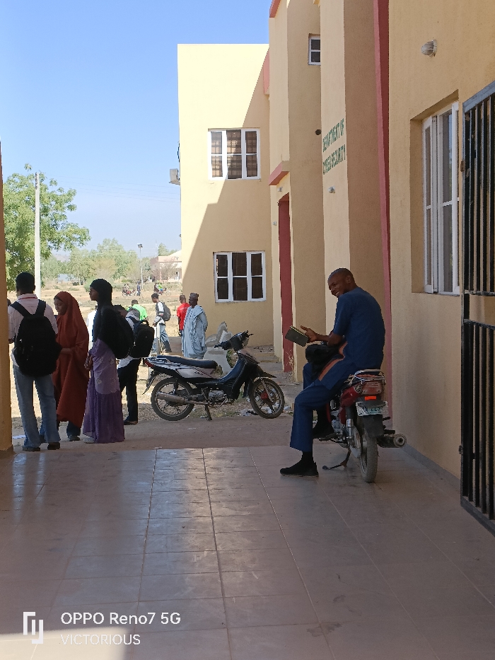 This image depicts an outdoor scene at the Federal University Dutse, in Dutse, Nigeria, specifically near the "DEPARTMENT OF CYBER SECURITY" building