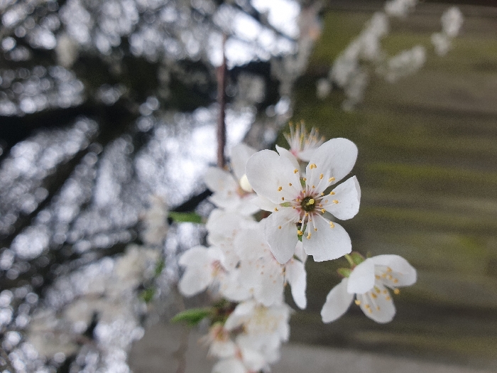 The image displays a close-up of white, five-petaled blossoms, indicative of a flowering tree, set in Great Yarmouth, United Kingdom. A central blossom is in sharp focus, revealing white petals, prominent yellow-tipped stamens, and a pale green pistil at its core. Two additional, slightly less focused blossoms are visible to the lower left, all attached to a thin, out-of-focus branch. The immediate background consists of a blurred wooden fence, composed of vertical planks in muted green-brown tones. The distant background features a heavily blurred canopy of a dark-branched tree, interspersed with diffuse white elements, likely distant blossoms or reflections, creating a bokeh effect. No human subjects, animals, or specific actions are depicted.