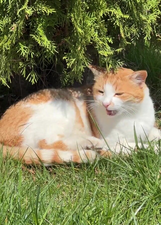 white and orange tabby cat lying in grass under the shade of a green bush. The cat yawns, stands up, and walks toward a park bench and a trash can, eventually passing behind the trash can. The video takes place outdoors on a sunny day.
