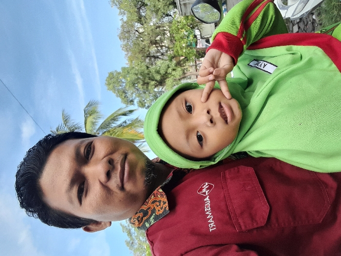 An outdoor daytime portrait captured in Ngampelsari, Indonesia, depicts two individuals: an adult male and a young child