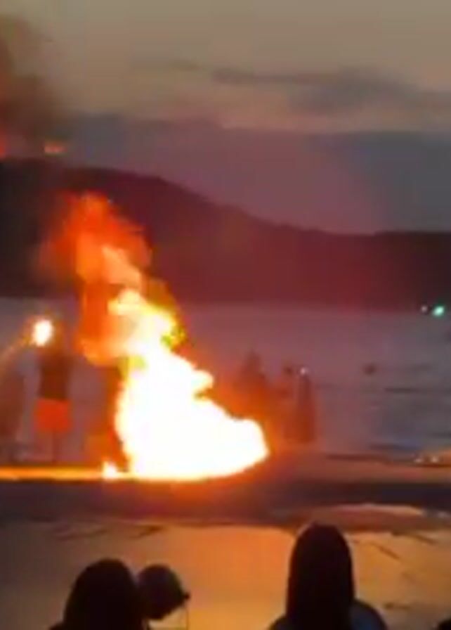 beachside fire performance at dusk. A fire breather unleashes a massive flame towards the sky. Another performer twirls lit torches. A group of people watches the spectacle on the sand, with some closer to the action and others standing farther back near the water. A man with his hands on his hips watches from the left of the frame. There are mountains across the water in the background. Some wooden structures, including a tripod, are visible on the sand.