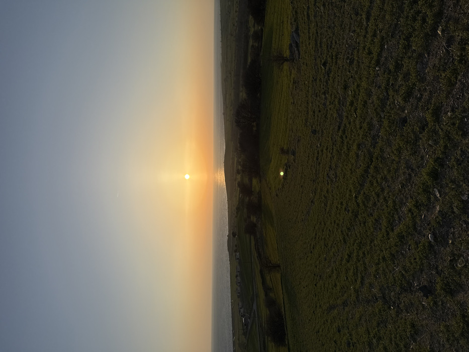 The image depicts a sunset over a coastal landscape in Alonia, Greece. The horizon is dominated by a calm, reflective body of water, likely the sea, spanning the width of the frame. The sun, a bright circular disk, is positioned slightly left of the center, low on the horizon, casting a distinct vertical column of light both upwards into the sky and downwards onto the water's surface. The sky transitions from a light blue at the top to a warm orange and yellow gradient near the horizon, illuminated by the setting sun. Below the horizon, a strip of land features distant green fields, scattered dark trees, and a cluster of light-colored structures, possibly buildings, connected by faint roads or paths on the far left. The midground consists of gently sloping green fields, cultivated with visible rows of vegetation. In the immediate foreground, dark green cultivated fields extend from the bottom of the frame, showing varied texture and some sparse, lighter patches of ground or rocks. A prominent circular green lens flare is visible in the mid-right portion of the foreground field. No individuals, animals, or specific actions are discernible within the frame. The environment is agricultural and coastal.