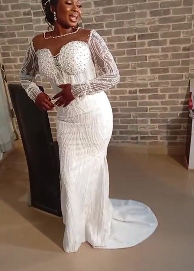 A woman in a white, beaded dress stands indoors, smiling and posing. She is standing in front of a brick wall and leaning against a black chair. She is wearing a beaded necklace and a beaded hairpiece. The room has tiled floors. A curtain can be seen in the background.
