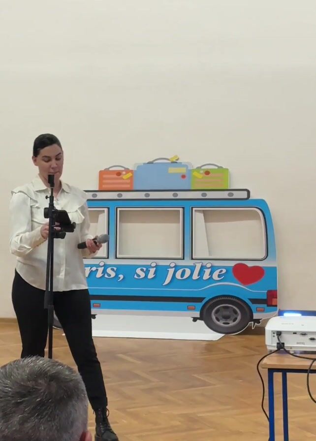woman singing into a microphone, accompanied by a man playing the acoustic guitar. They are on a stage, with an audience watching from their seats. The woman is wearing a white blouse and black pants, and the man is wearing a black shirt and black pants. A blue and white bus cutout is on the stage behind them. A laptop and projector are set up on a table near the stage. The room is well-lit and has wood floors and a red curtain in the background.