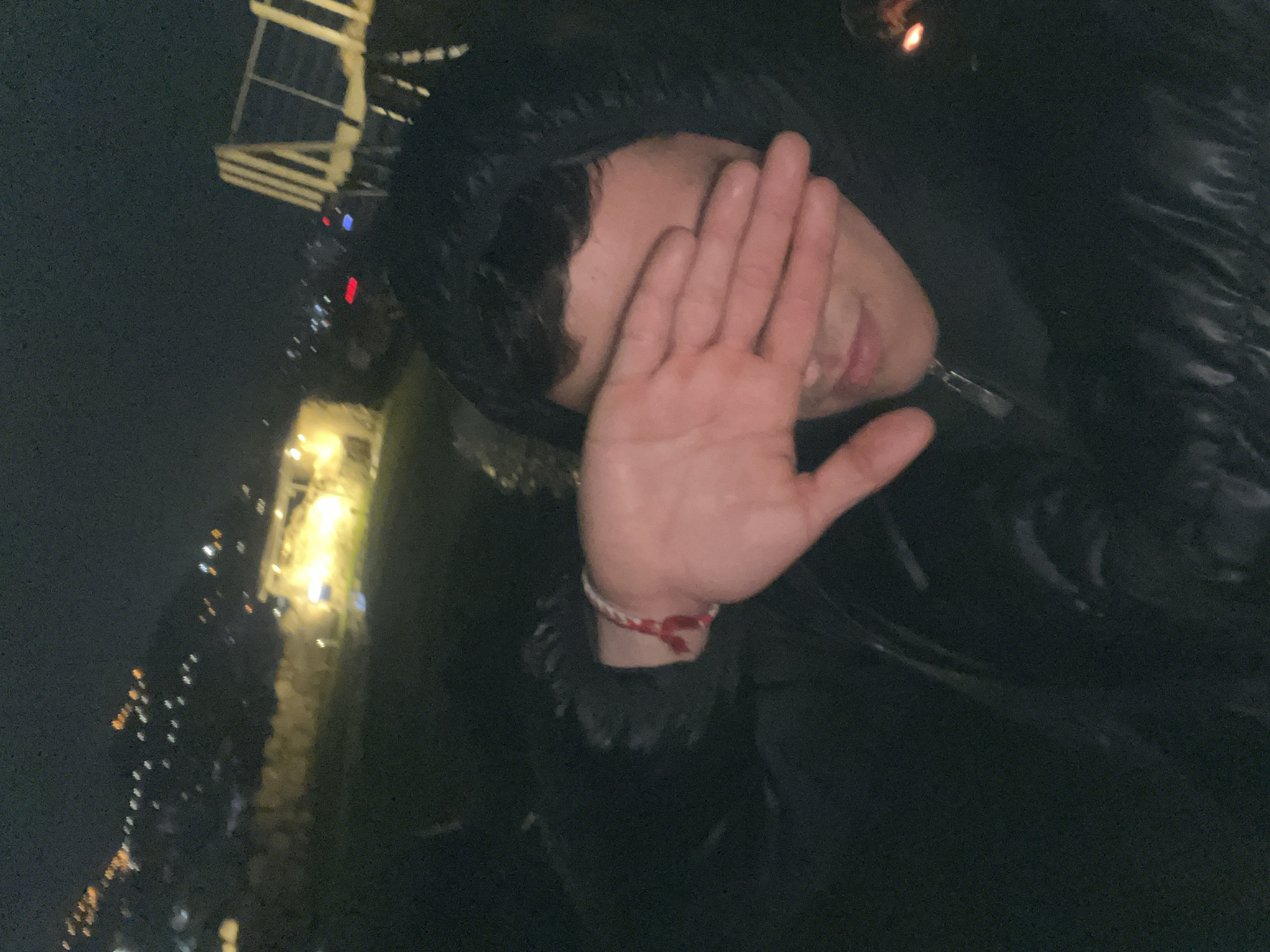 A single individual is depicted in a medium close-up, outdoors at night. The subject, appearing young, wears a dark, possibly black, hooded jacket with a visible zipper pull. Their right hand is positioned horizontally across their face, obscuring their eyes and forehead. A red and white braided bracelet is visible on their right wrist. The lower portion of their face, including the mouth and chin, is visible. The background is dark and out of focus, indicating an urban environment at night in Plovdiv, Bulgaria. Distant city lights are visible, scattered across what appears to be a hillside or elevated terrain. To the left, a large, illuminated structure with light-colored, possibly stone or concrete walls is present, suggesting historical architecture or a significant building. To the right, an abstract, light-colored structure composed of multiple vertical or angled elements is faintly visible, possibly a modern architectural feature or part of a bridge. Faint red and blue lights, consistent with distant vehicle lights or illuminated signs, are also discernable in the background. The scene is illuminated by ambient city light and a direct light source, possibly a camera flash, highlighting the subject's hand and face.