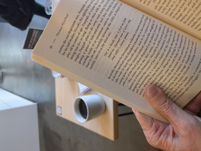 person holding open a book titled "Thomas Pynchon." The visible text on the pages describes a plot involving characters Pasquale and Niccolo, discussing themes of illegitimacy, power, and betrayal within a ducal court. The scene hints at intrigue, with Pasquale plotting against Niccolo and potential violence involving a cannon. The narrative involves characters scheming, masquerading, and engaging in political maneuvering in a historical setting. A coffee cup sits on the book's edge.