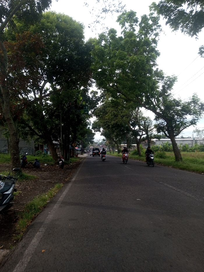 This image depicts a street scene within the city of Phonsavan, Laos, under an overcast sky. The view is along a two-lane asphalt road, looking into the distance where traffic is observed. On the left side of the frame, a dirt and grass shoulder borders the road. Large, mature trees with dense green foliage, some showing reddish-brown leaves, line this side, casting significant shade. Beneath these trees, two individuals are seated on the ground; one wears a blue shirt, the other a darker garment. A white object, possibly a bag, rests near them. Partially visible in the bottom left foreground is a parked dark-colored scooter. Further back along the left shoulder, another light-colored scooter is parked. Beyond the trees and shoulder, portions of a light-colored building are visible. The paved road occupies the center and right side of the image. A faint white line marks the edge of the road on the left. Three individuals are operating scooters on the road, moving away from the viewer. From closest to furthest, a dark-colored scooter is ridden by a person in dark attire, followed by a reddish-orange scooter with a similarly dressed operator, and a dark-colored scooter further ahead. In the distance, a dark-colored car is visible, along with other vehicles suggesting a continuation of the street. On the right side of the road, a strip of grass is present, beyond which a low, light-colored structure or wall is discernible. Several large trees with green leaves also line this side, leaning towards the road. Utility lines are faintly visible against the bright, overcast sky in the upper right.