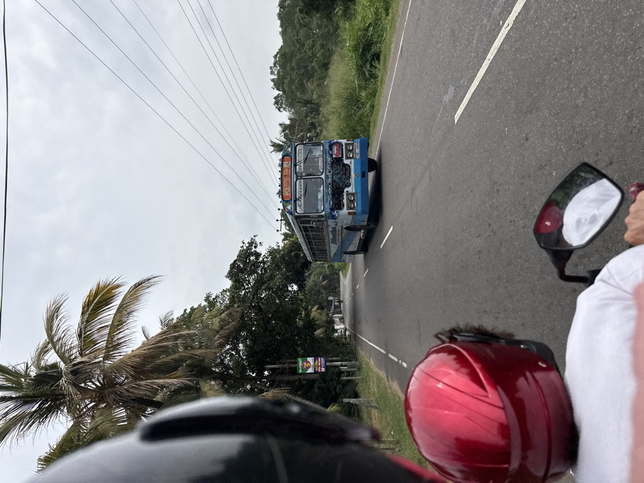 A bus approaches on a paved road lined with trees and a palm tree, captured from a motorcycle's perspective. The bus is painted in blue and white, displaying several messages. The rider wears a red helmet, and the motorcycle's mirror is visible. Power lines stretch overhead beneath a cloudy sky.