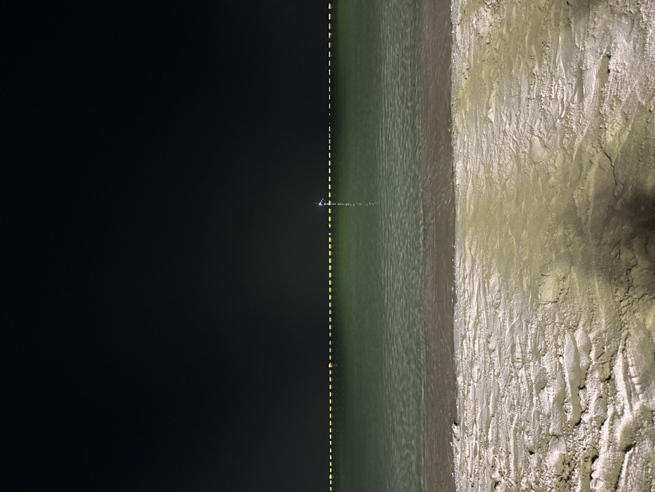A nighttime shot shows a body of water meeting a shoreline. The left side is dark, with a faint light reflecting on the water. A dashed yellow line delineates the water from the darkness. The right side shows a sandy, textured shoreline with varied shades of tan and gray. The overall image is sideways.