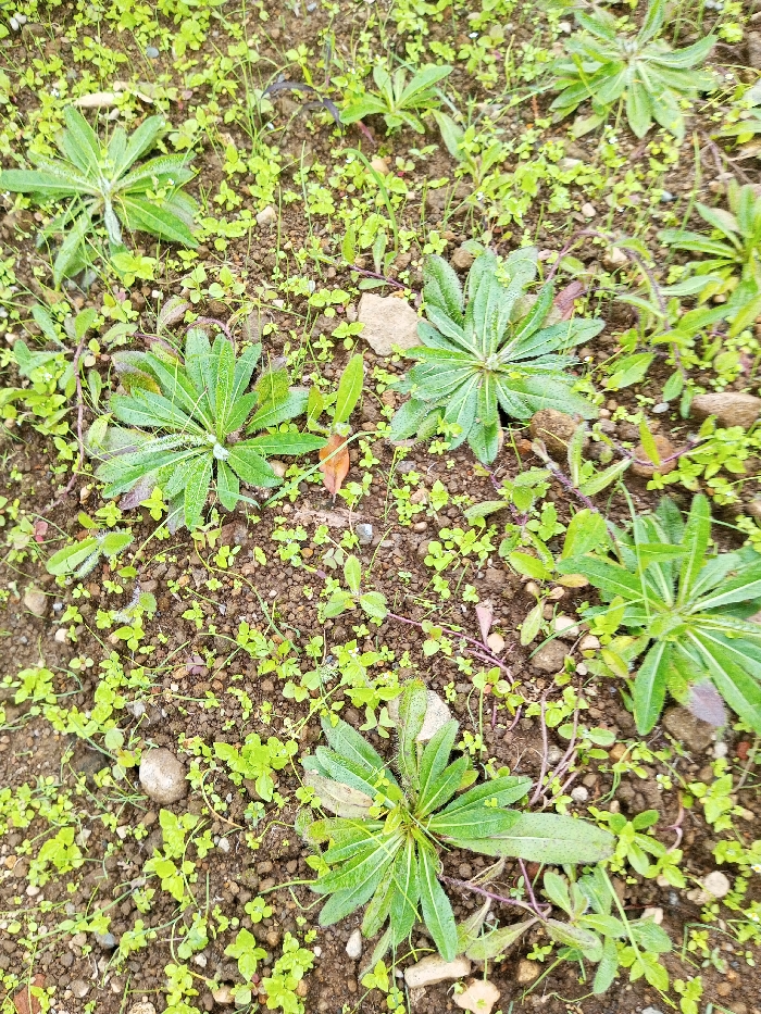 A ground-level view showcases a patch of soil interspersed with varying plant life. Rosettes of green, slightly hairy leaves radiate outwards, surrounded by a dense ground cover of small, rounded, light green plants. Some reddish-purple stems intertwine among the greenery. Scattered pebbles and debris break up the soil surface, adding texture to the scene. The plants are evenly distributed, creating a vibrant, natural ground cover.