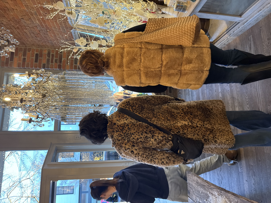 Three people stand in a row inside a store. The first person wears a tan coat and black pants, the second person wears a leopard print coat and jeans, and the third person wears a blue sweatshirt and light-colored pants. Behind them is a window and a chandelier. Above them is a brick wall and decorative lights.