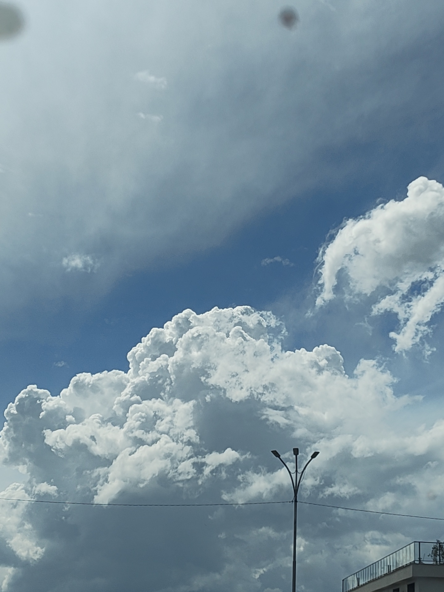 daytime view of a sky with a mix of cumulus and cirrus clouds. A portion of blue sky is visible. A street light with three lamps is situated near the lower center of the frame, with a horizontal wire spanning across the scene behind it. The corner of a building with a glass railing is visible in the lower right corner. The location is Burgas, Bulgaria.