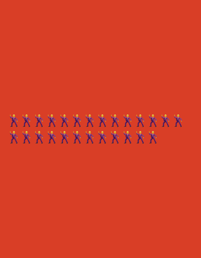 Against a burnt orange background, there are two rows of the "man in suit levitating" emoji