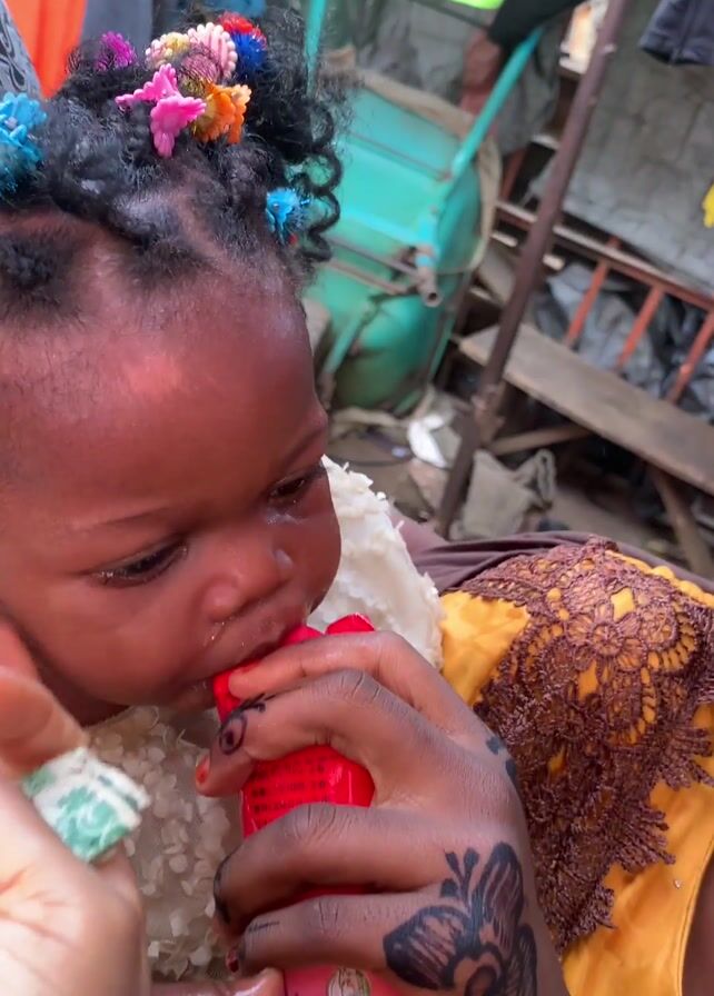 A young African-American girl, adorned with colorful hair clips, is held by an adult with henna tattoos on their arm. The girl drinks from a red and pink juice pouch, tears visible on her face. The background is somewhat cluttered with a green container, a ladder, and other people.