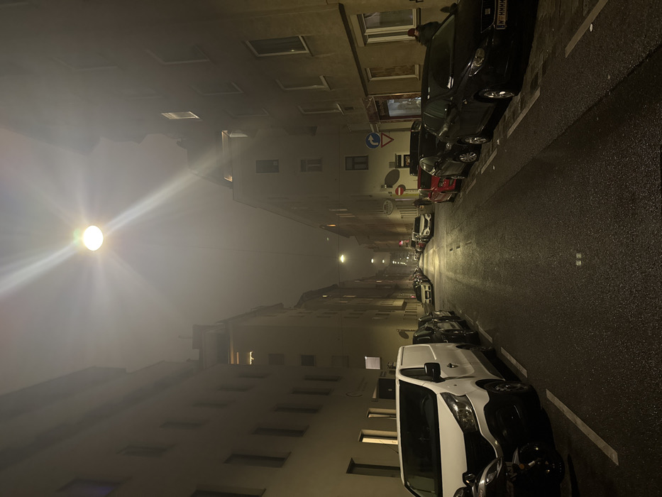 A nighttime street scene exhibits parked vehicles lining both sides of a narrow, rain-slicked road. Buildings stand tall, illuminated by the soft glow of streetlights, which are partially obscured by fog. The perspective emphasizes the street's length, disappearing into the misty distance. A solitary streetlamp in the foreground is visible.