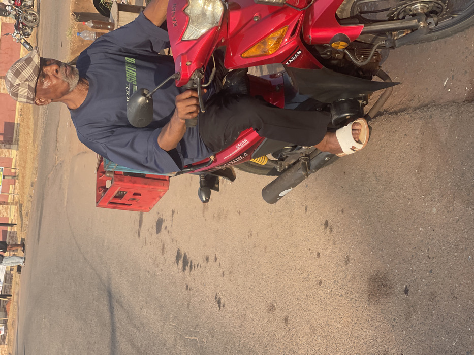 In the city of Alor, Nigeria, an elderly male with dark skin and a gray beard is seated on a red KASAN brand motorcycle on a paved asphalt road