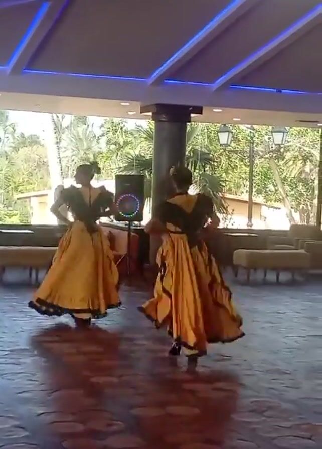 Two women wearing identical yellow dresses and black vests, with their hair styled up, are dancing indoors on a tiled floor. They turn and step to the music, each holding up the sides of their long dresses. A speaker on a stand is in the background. Outside, trees and a building are visible. The space has lounge seating and a ceiling with blue lights.