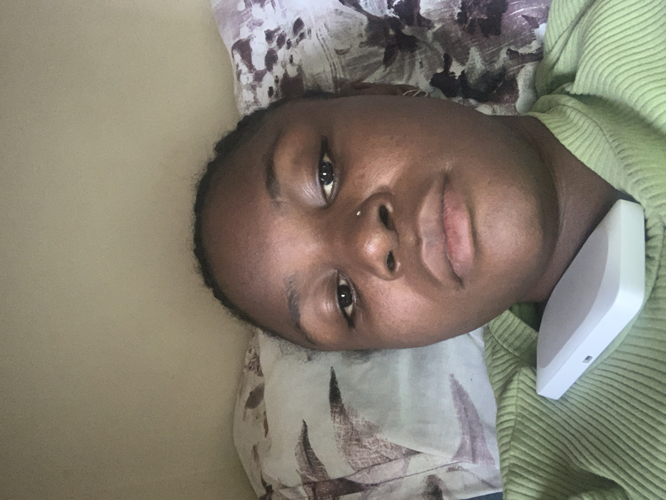 The image displays a close-up, head-and-shoulders view of an individual, identified as being in Tempure, Nigeria, though this location is not verifiable from visual evidence. The subject is a young adult female with dark skin, dark eyes, and braided hair pulled back from her forehead. She has a small silver nose stud in her left nostril. Her expression is neutral, and she is looking directly at the camera. She is wearing a light green, ribbed garment. Resting horizontally on her chest, just below her neck, is a white, rectangular electronic device with rounded corners and a small, elongated indentation on its side. Behind her head and to her left is a pillow with a patterned fabric featuring brown and white abstract or floral designs. Another patterned fabric is partially visible to her right. The background consists of a plain, light-colored wall. The individual appears to be in a reclined position, possibly in a bed.