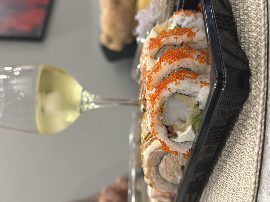 This image depicts an indoor dining scene in Vratsa, Bulgaria. In the foreground, a black rectangular plastic container holds several pieces of sushi rolls. One type of roll features white rice, a filling of tempura shrimp, cream cheese, and a green element, topped with numerous small orange fish roe (tobiko). Another visible sushi roll type contains a crab stick-like filling, covered with a white creamy sauce and a dark, glossy drizzle. Behind the sushi, slightly to the right of center, a clear stemmed wine glass holds a pale yellow liquid, identified as white wine. The container and glass are positioned on a light brown or beige woven placemat. The background is out of focus, revealing a plain light-colored wall. A blurred human hand is partially visible on the left side of the frame, suggesting at least one individual is present. On the right, indistinct blurred objects include a dark-framed item with a red element and a light-brown, rounded object. The scene appears static, capturing a moment prior to or during a meal.