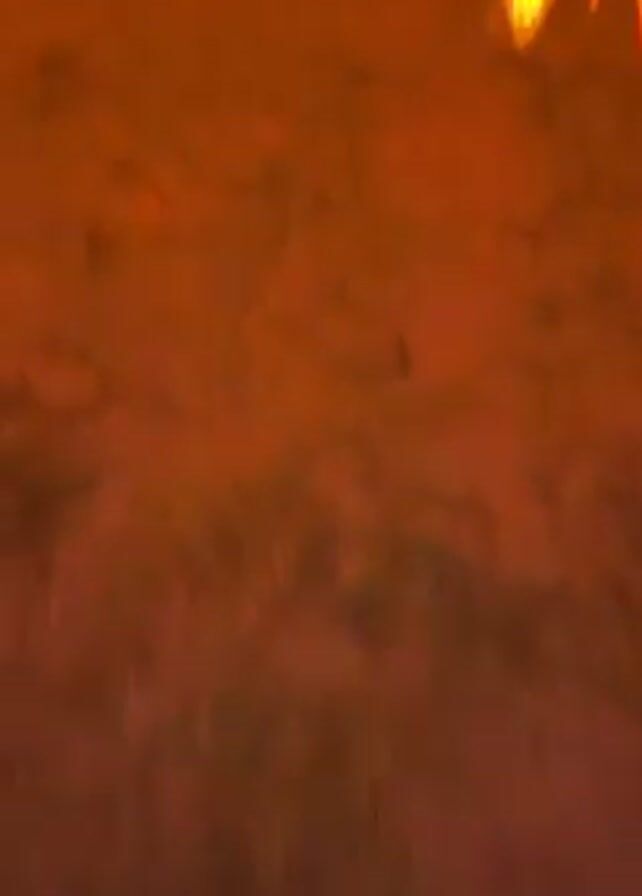 nighttime scene inside a tent at what appears to be a party. People are standing and moving around in the foreground, silhouetted against a background of bright yellow and blue lights. The camera is moving, shifting the focus up to the ceiling of the tent which is also lit with the same colorful lights.