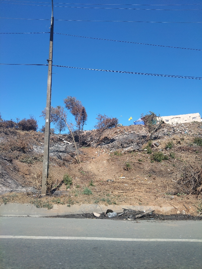 A desolate landscape with a utility pole prominently placed on the left. Burned vegetation covers a hillside ascending to a structure topped with rubble. A blue tent and a yellow flag punctuate the scene. Debris and trash are scattered near a road's edge in the foreground, suggesting recent roadside cleanup. The sky is cloudless and blue, highlighting the stark contrast with the muted earth tones. The overall impression is one of environmental degradation and neglect.