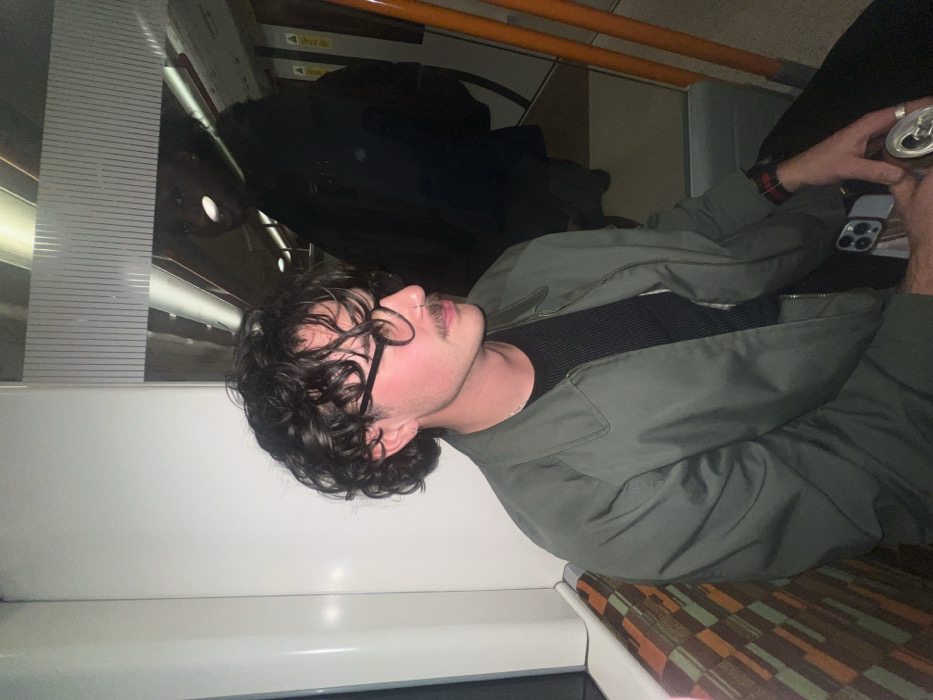A male individual is seated in profile facing right inside a subway train carriage in the city of Unknown, Unknown