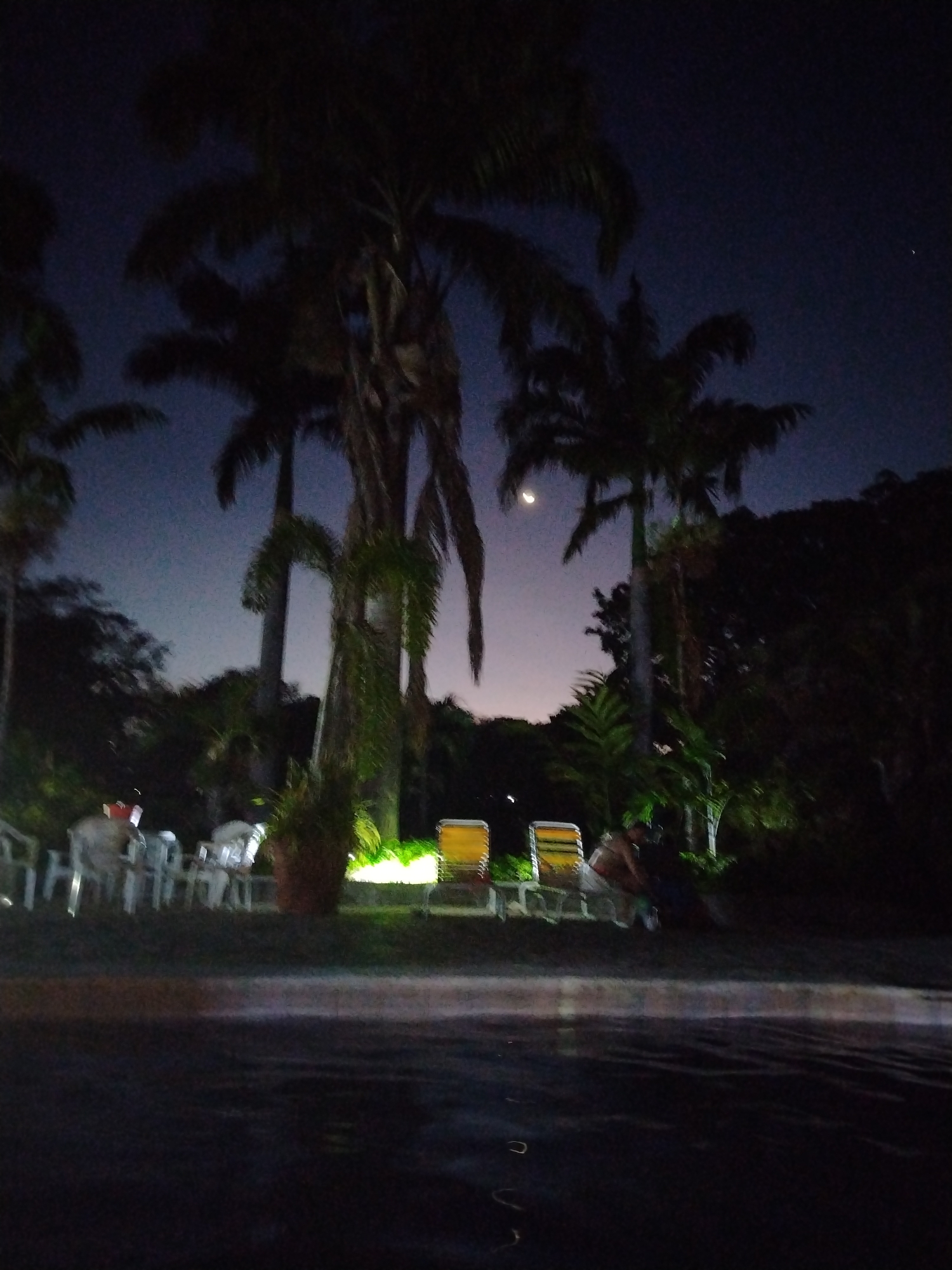 The image depicts a night scene, likely in a tropical location. Several palm trees are prominent in the frame. A crescent moon is visible in the dark sky. In the midground, there are white chairs near a potted plant. Two yellow lounge chairs sit under a light source. Two individuals appear to be interacting near the lounge chairs. In the foreground, a body of water, possibly a swimming pool, is visible, with reflections on its surface. The location is indicated as being in Marta, Venezuela.