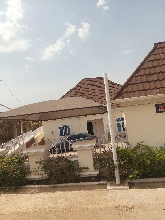The scene, located in Kwang, Nigeria, depicts a property during daylight hours under a light blue sky with scattered white clouds. The immediate foreground consists of an unpaved dirt or gravel surface. Two light cream-colored buildings with distinct brown tiled roofs are present. The left building, a single-story structure, features blue-framed windows and a covered car park with a light brown fabric canopy extending from its front. A dark-colored sedan is parked underneath this canopy. White balustrades with decorative square pillars form a barrier along a raised elevation in front of the building. Green bushes and shrubs are planted at the base of these balustrades and along the foreground boundary. To the right, a second, partially visible building, also light cream with a brown tiled roof, displays a blue sign bearing a white capital "K" on its facade. A tall, white vertical pole stands centrally in the mid-ground. Overhead power lines are visible in the upper left portion of the image. No individuals or animals are present.
