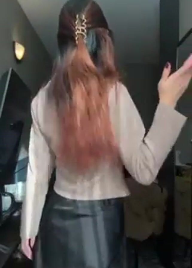 A woman stands in a hotel room. The room is small with gray walls and an off-white bed in the background. The woman has long, auburn hair and is wearing a tan cardigan, a black skirt, and leopard print shoes. She turns around to show off her outfit.