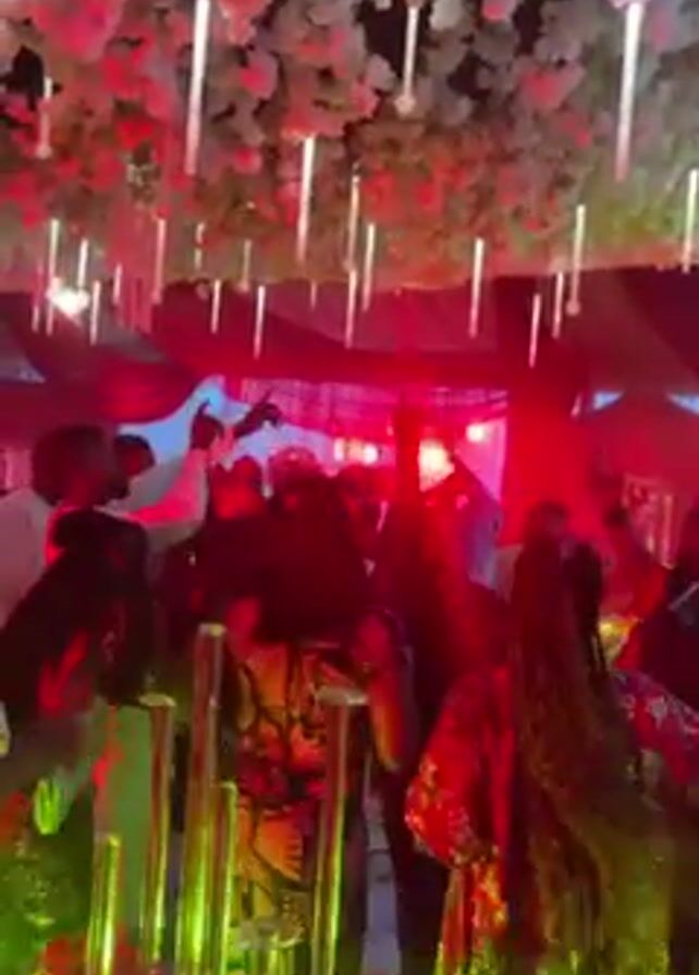 crowd of people dancing under a decorated ceiling at what appears to be a party or wedding reception. The ceiling is adorned with white floral arrangements and hanging light fixtures. The lighting in the room is colorful, mainly red and green. People are dancing and moving around. The camera is shaky and moves slightly, giving a view of the dancing crowd and the ceiling decorations.