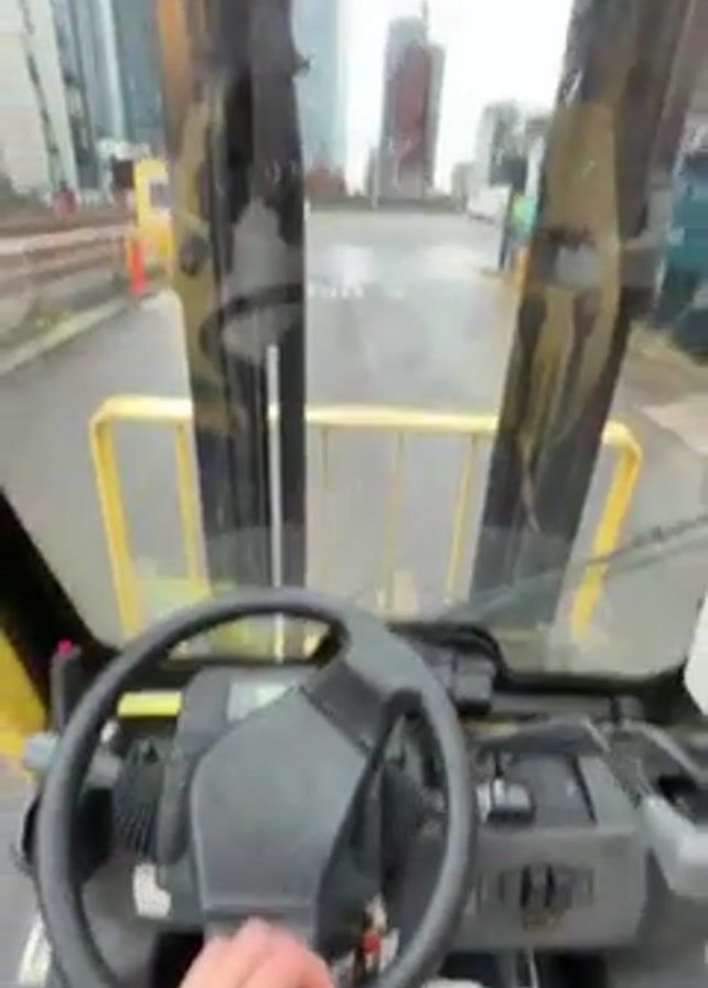 first-person perspective of someone operating a yellow forklift on a wet, paved surface. The person, wearing white pants, steers the forklift forward, with a yellow safety barrier visible in the immediate foreground. The background reveals a city skyline with tall buildings. The interior of the forklift cabin is visible, including the steering wheel, dashboard, and levers. The overall scene suggests an industrial or construction environment.