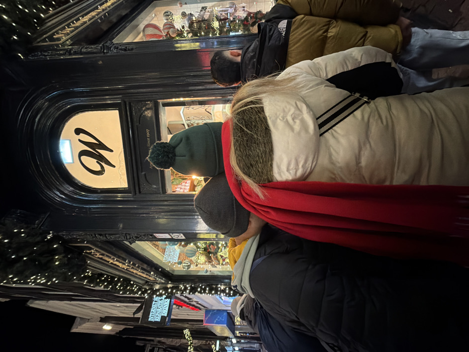 A group of people looks in a shop window at night. A red scarf hangs around one person's neck. One wears a green knit hat with a pompom, and another a gray knit hat. The shopfront has Christmas lights. Inside the window, there are ornaments and a large "W" logo on a white background. The shop has been open since 1907.