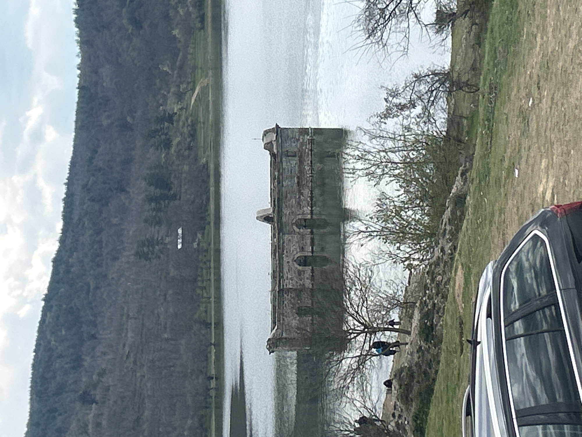 partially submerged stone structure with arched windows and a possible cross on top, located in the Zhrebchevo Reservoir in Bulgaria. The reservoir extends into the distance, bordered by a forested hillside on one side and a grassy bank on the other. Several people are near the water's edge by a barren tree and green grass. A black car occupies the right side of the frame. The sky is overcast.