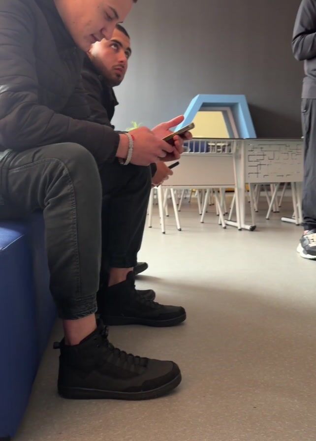 The video depicts a room with three people sitting on a bench and two people standing. The first person sitting is using a smartphone, and the person next to them looks on. The person standing closest to the camera wears black athletic clothing, including a jacket. The second person standing wears a brown jacket, a striped shirt, and blue jeans. They have their hand on their hip and appear to be speaking. Tables are stacked along the back wall, and the room appears to be in a school or office setting.