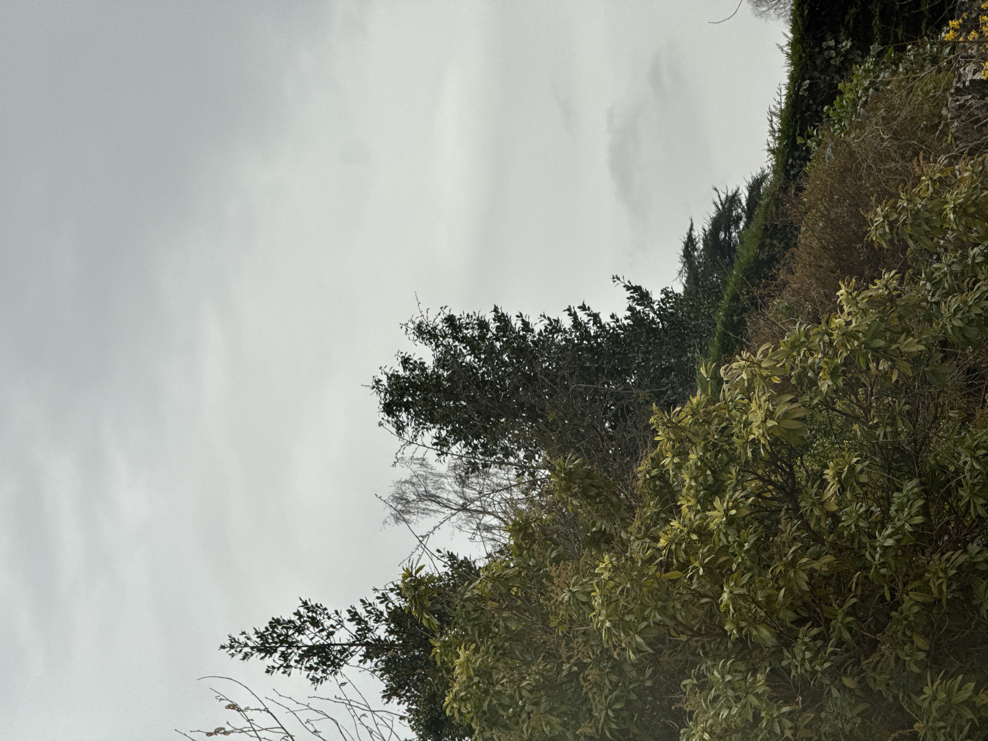The image displays an outdoor scene in Windermere, United Kingdom, under an overcast, light grey sky. The lower two-thirds of the frame are filled with dense, mixed vegetation. A prominent cluster of broadleaf evergreen shrubs or small trees with vibrant yellow-green leaves and nascent buds occupies the foreground and mid-ground. To the left, a taller, dark green evergreen tree rises into the upper left quadrant. Bare, slender deciduous branches, possibly with catkins, are visible on the far left, while a distinct light-barked deciduous tree with fine bare branches is positioned in the mid-background. The right side features a dense, dark green hedgerow or treeline, partially obscuring the background, with a small section of bright yellow blossoms visible in the lower right corner. No individuals, animals, or man-made objects are present. The scene indicates a temperate climate, consistent with late winter or early spring.