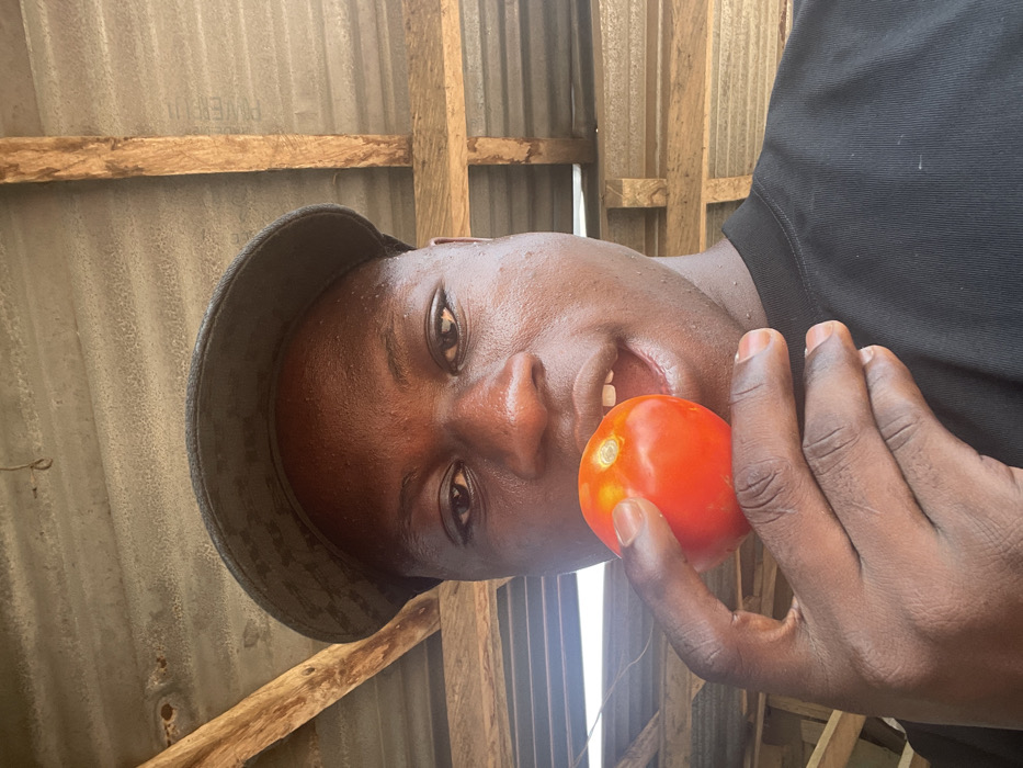 A dark-skinned male, wearing a dark cap and black t-shirt, is depicted from the chest up, looking directly at the viewer. He holds a single, ripe red tomato in his left hand, positioned close to his slightly open mouth, as if preparing to consume it. His skin appears slightly moist. The background consists of a corrugated metal roof supported by visible rough-cut wooden beams and planks, indicating a sheltered, possibly open-air, structure. The scene is located in Ajara, Nigeria.