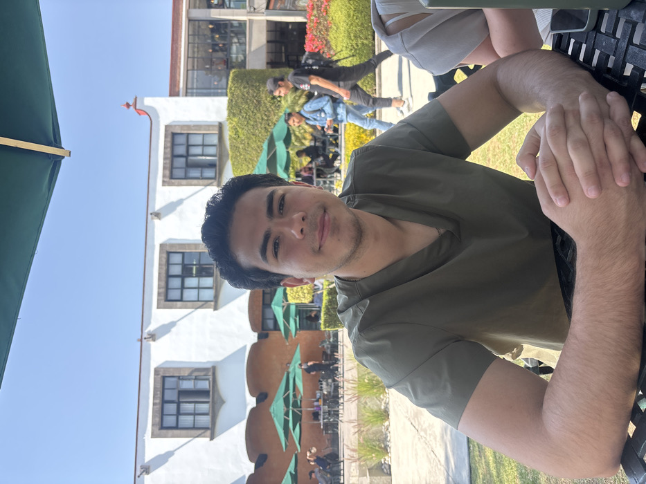 A young man sits at an outdoor table, gazing at the camera with a slight smile