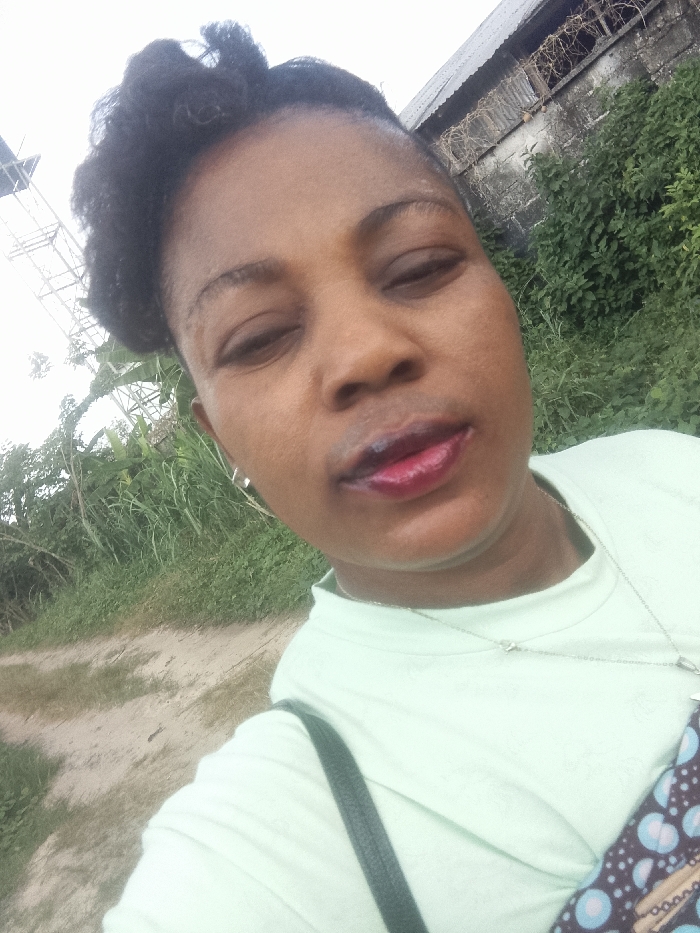 An adult female of African descent is centered in a close-up, upward-angled outdoor photograph. She has dark skin, with her eyes appearing closed or heavily squinted. Her dark, textured hair is styled upwards. Her lips are coated with a dark red or plum-colored gloss or lipstick. She wears small, silver-colored hoop earrings and a thin, silver-colored necklace with small pendants. Her visible clothing includes a light green t-shirt, worn over a dark garment featuring light blue circular patterns, partially visible on her right. A dark strap, likely from a bag, crosses her left shoulder. Visible perspiration is present on her forehead. The background on the left side of the frame consists of a bright, overcast sky. Against this sky, a tall metal lattice structure, possibly a communication mast or water tower, is partially visible. Below the structure and to the left, dense green vegetation, including tall grasses and broad-leaf plants, extends down to a dirt path. The background on the right features a weathered, grey-colored wall, likely constructed from concrete blocks, with a corrugated metal roof visible above it. Barbed wire is affixed along the top edge of the wall or an adjacent structure. Overgrown green foliage stands directly in front of this wall. While the image depicts an environment consistent with a semi-urban or peripheral area, specific landmarks or identifiers within Warri, Nigeria, are not discernible to pinpoint the exact location.