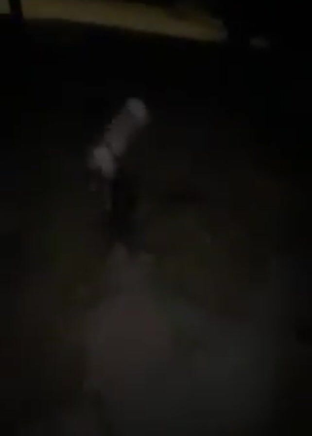 dog on a leash being walked along a sidewalk at night. The scene is dimly lit by streetlights. The dog is mostly brown and white, with a fluffy white tail. The sidewalk is bordered by a grassy area on one side and a street on the other. The camera seems to be hand-held, and the perspective is from behind the dog.