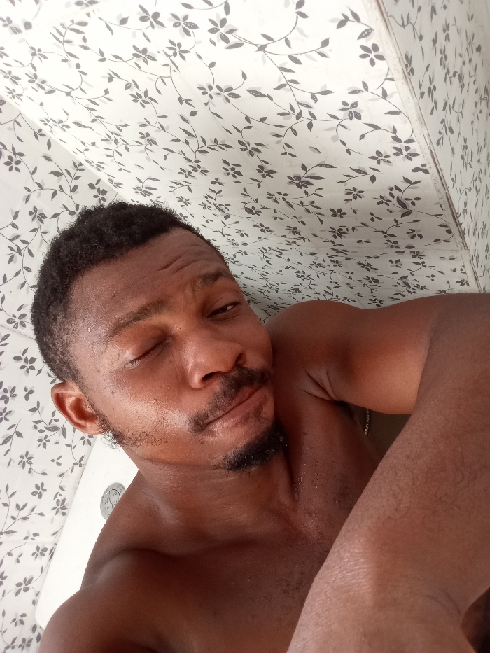 A shirtless dark-skinned man is looking at the camera and winking. He has short dark hair and a closely trimmed beard. The background is a white wall covered with small black floral patterns. Part of a white scale can be seen behind the man. The image is taken at an upward angle. The man's right arm and shoulder are prominent in the foreground, suggesting a selfie perspective.