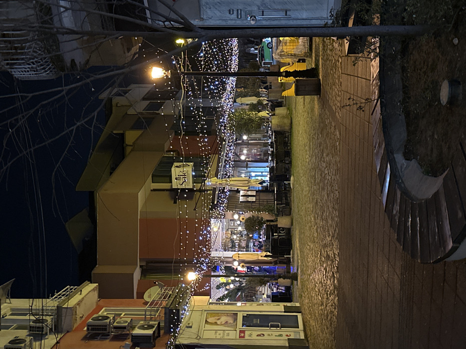 The image captures a nighttime view of a pedestrian street or square, identified as Otets Paisiy Street in the Old Town of Plovdiv, Bulgaria. The scene is illuminated by numerous strings of small, white LED lights crisscrossing overhead, creating a festive canopy, complemented by the warm, yellowish glow of several ornamental street lamps. The central ground area is paved with cobblestones. On the left, a multi-story building features a reddish-orange facade, white balconies with railings, and multiple external air conditioning units. Its ground level includes a storefront with vertical "Mr. Bebe" signage and a graphic of a laughing child. Adjacent to this, and extending into the background, are multiple commercial establishments, most notably "Salié Bar & Dinner," indicated by a square sign. These establishments extend their operations outdoors, furnished with numerous dark-colored tables and chairs, and several folded light-colored umbrellas. Several indistinct figures are visible seated at these outdoor tables and inside the establishments, indicating patronage. In the foreground, a darker paved path leads to a curved wooden bench with a concrete base, bordering a small, sparse garden bed. To the right, a bare-branched tree stands next to a lamppost, at the base of which are two wooden trash receptacles. Beyond the outdoor seating areas, in the distant background, a light green taxi is partially visible, suggesting the presence of an adjacent roadway. The sky above is dark, indicative of nighttime.