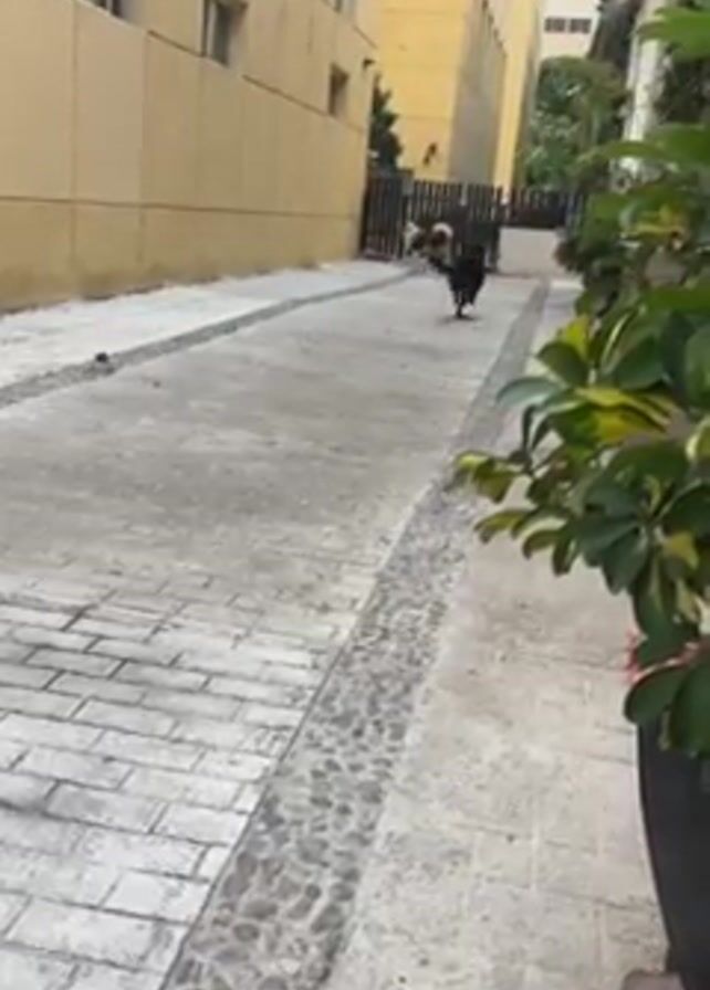 two dogs in an outdoor setting. A black dog runs toward the camera on a paved walkway, followed by a smaller, lighter-colored dog in the background. The walkway is bordered by a building on the left and greenery and a potted plant on the right. The buildings appear to be multiple stories tall. A portion of a black chair is visible in the lower left corner of the frame. The sky is overcast.