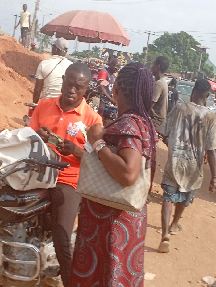 A man in an orange shirt counts money in front of a motorcycle. A woman in a red patterned dress holds a beige handbag. Several people stand nearby, including one on a dirt mound and another in a soiled white t-shirt. A large umbrella provides shade in the background, with additional people and vehicles visible in the bustling scene.