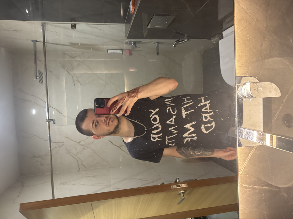 A male individual is depicted in a mirror selfie within a modern bathroom located in Ambala, India