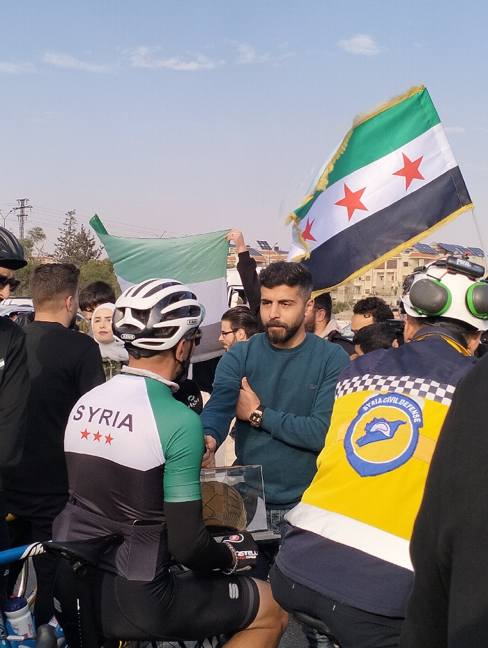A group of people gathered outdoors is observing a cyclist in a green, white, and black jersey with "SYRIA" and three stars on the back. He shakes hands with a man in a teal sweater. Two Syrian flags are visible. One is held aloft, and another is a traditional horizontal tricolor with a gold fringe. A person wearing a yellow vest with "SYRIA CIVIL DEFENSE" on the back stands nearby.