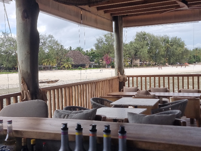 The image captures a view from an elevated, open-air beachfront establishment in Michamvi Kae, Tanzania, looking out towards the sea