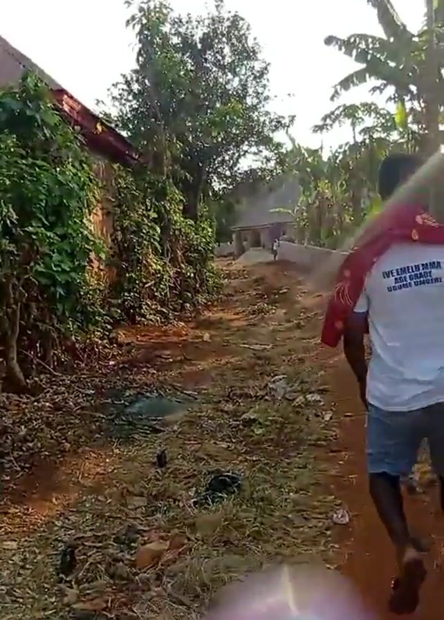 A man is walking away from the camera down a dirt road in what appears to be a rural area