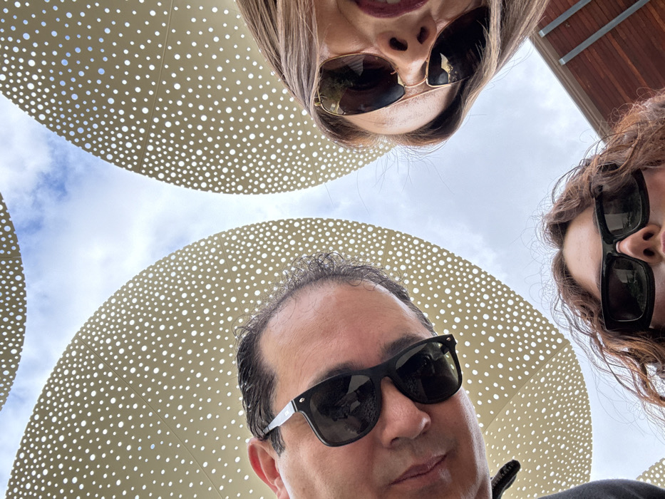 Three people are angled towards the camera, each wearing sunglasses. A light tan structure with small, circular cutouts is visible in the background, along with glimpses of the sky and clouds. The person in the middle has darker hair and is wearing black framed sunglasses. To the right is a person with curly red hair and black sunglasses. At the top of the frame is a person with long brown hair and aviator style sunglasses.