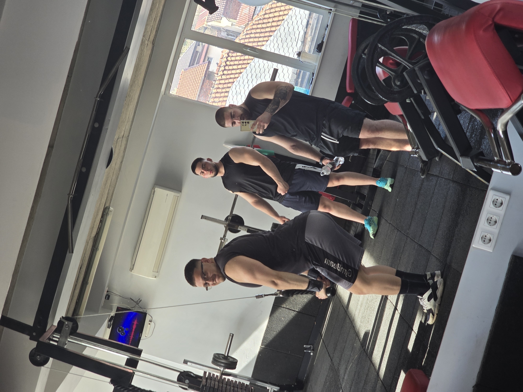 scene inside a gym. Three men are present. The man closest to the camera is wearing a black tank top, grey shorts, black socks, and white sneakers. He is using a cable machine to perform a tricep pushdown exercise. The second man is standing behind him, wearing a black tank top, blue shorts, and turquoise sneakers. The third man is standing behind the second man, taking a selfie with his phone. He is wearing a black tank top and black shorts. In the background, there is a window showing rooftops, which is suggestive of an urban setting. The context of the location is Buhovo, Bulgaria.